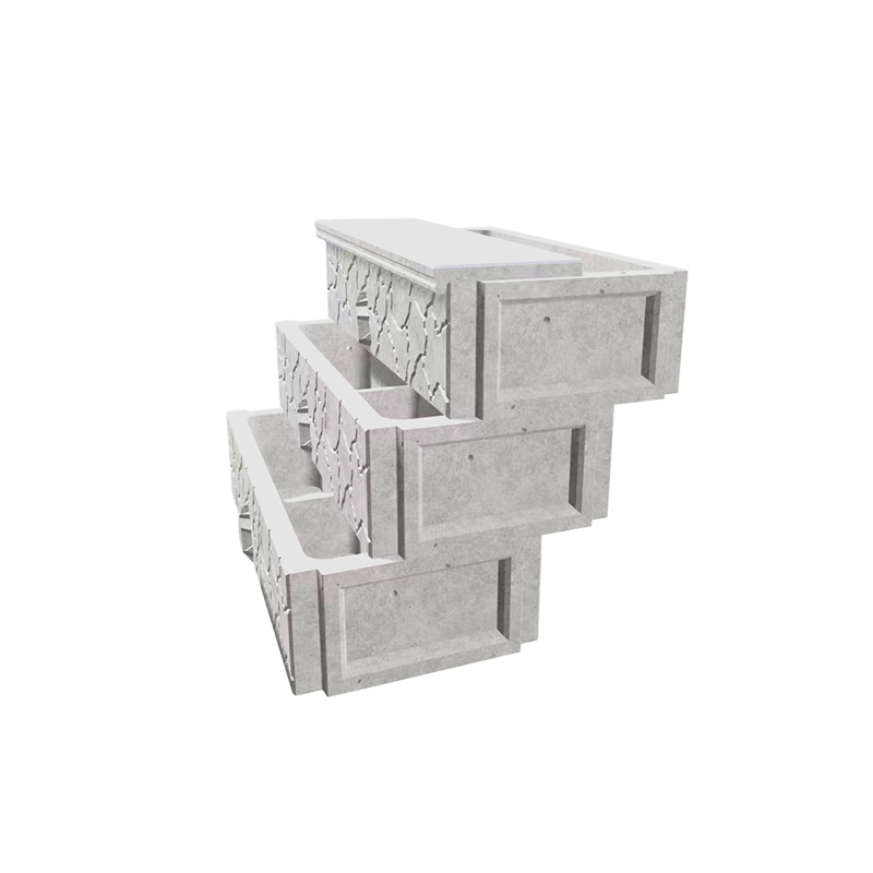 用于阶梯挡墙的压顶,有以下作用:1、增加了砌块的整体性,并形成了闭合2、有效防止因雨水冲刷导致隔舱内土的流失3、为维护绿植、观景人员提供了落脚平台4、加了挡土高度、减少了后方堆土的流失5、保护了挡墙面板的美观